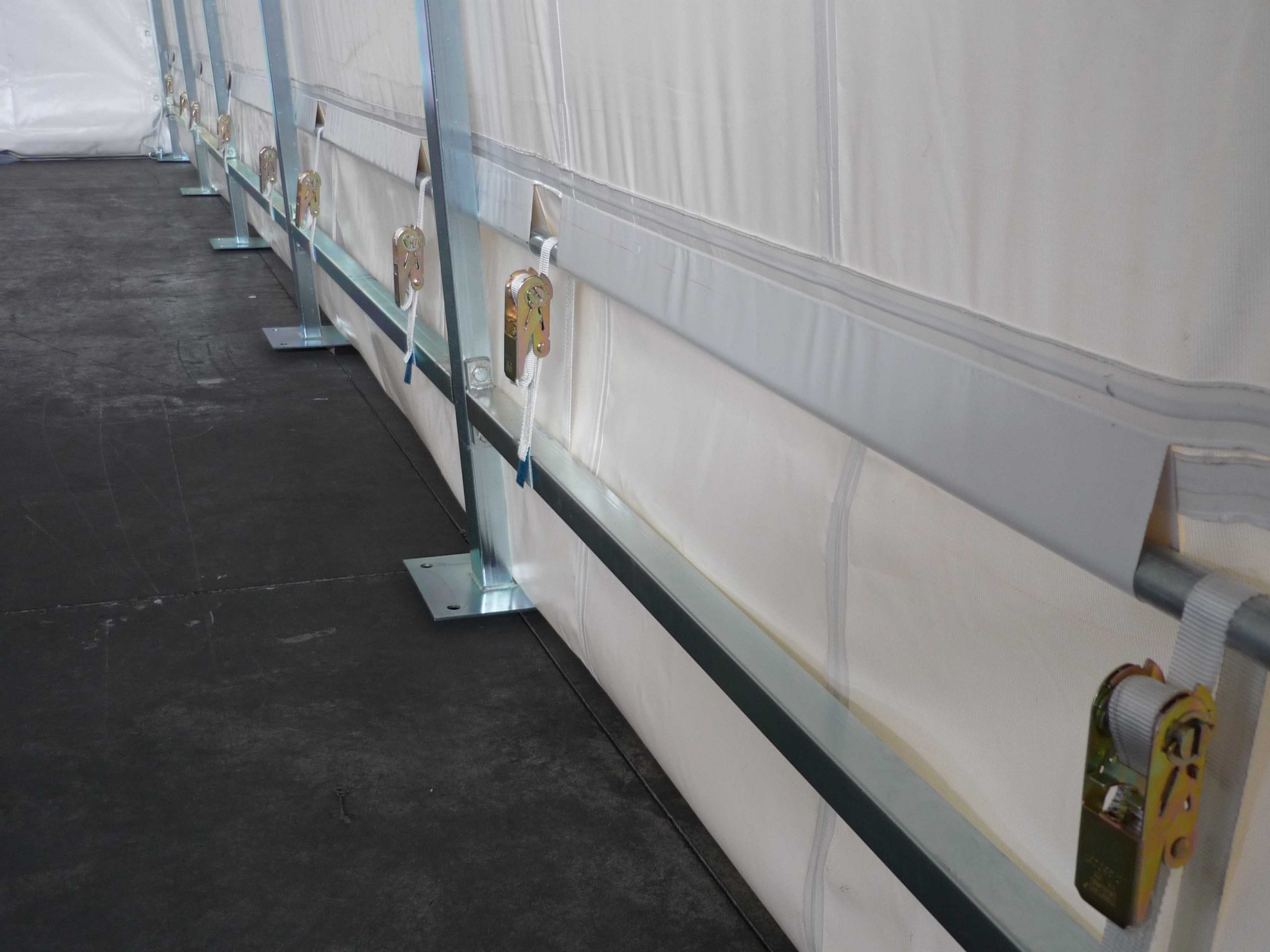 Il fronte ha luce da 5m fino 10m, ed altezza massima al centro pari a 5.2m. I portoni di ingresso realizzati in telo scorrevole permettono il passaggio di automezzo fino ad una altezza di 3.7m. Struttura in acciaio zincato a caldo e tamponature in membrana di tessuto PVC. La robustezza strutturale ne garantisce la sicurezza e la possibilità di installazione in qualsiasi luogo, come zone ad alta intensità di vento, di sisma marittime o montane.